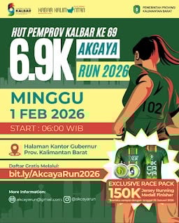 Dalam rangka memperingati HUT ke-69 Pemerintah Provinsi Kalimantan Barat, akan digelar 6,9K AKCAYA RUN 2026 yang mengajak masyarakat untuk memulai hari dengan semangat sehat dan penuh kebersamaan. Kegiatan ini akan berlangsung pada Minggu, 1 Februari 2026, dengan titik start pukul 06.00 WIB di Halaman Kantor Gubernur Kalimantan Barat. Acara ini juga akan dimeriahkan dengan berbagai aktivitas pendukung seperti zumba, fun games, doorprize, dan DJ performance, menjadikannya bukan sekadar ajang lari, tetapi juga perayaan yang penuh hiburan. Selain fun run, turut digelar Senam Kreasi Competition yang terbuka untuk instansi pemerintah dan masyarakat umum, sebagai wadah menampilkan kreativitas, kekompakan, dan semangat hidup sehat dalam suasana kompetitif yang positif.