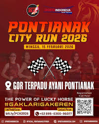 Pontianak City Run 2026 akan digelar pada 15 Februari 2026 dengan titik start dan finish di GOR Terpadu Ayani, Pontianak. Event lari ini menghadirkan kategori 5K, 10K, 21K, dan 42K, serta terbuka untuk pelari dari berbagai daerah. Selain berlari, peserta juga dapat menikmati suasana sport tourism dan dukungan UMKM lokal. Info lengkap dan pendaftaran bisa diakses melalui @official_pontianakcityrun.